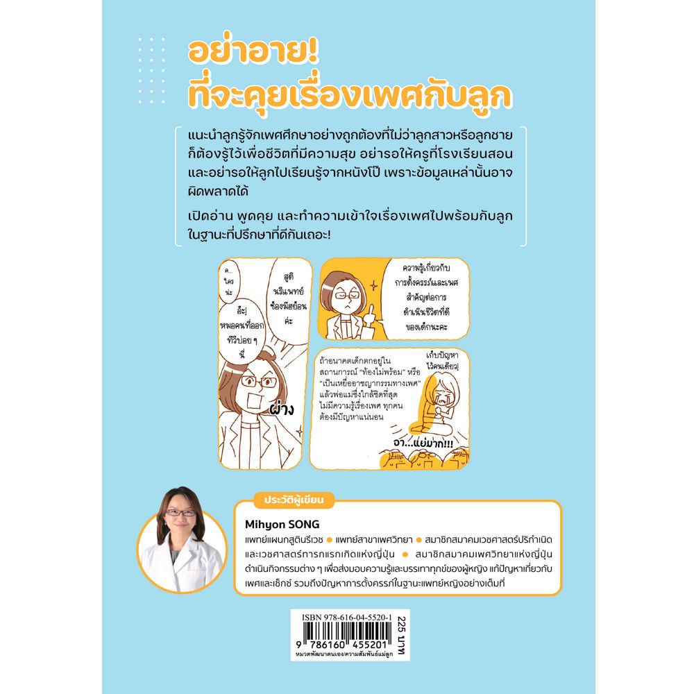 คุยกับลูกเรื่องเพศ อย่ารอให้ครูที่โรงเรียนสอนและอย่ารอให้ลูกไปเรียนรู้จากหนังโป๊ เพราะข้อมูลเหล่านั้นอาจผิดพลาดได้! “Sex-education คุยกับลูกเรื่องเพศ” จะอธิบาย ไขข้อสงสัย และแก้ความเข้าใจผิดทุกเรื่องเกี่ยวกับเพศศึกษา ตั้งแต่การเปลี่ยนแปลงทางร่างกายเมื่อเข้าสู่ช่วงวัยรุ่น ระบบสืบพันธุ์ การคุมกำเนิด สุขอนามัยทางเพศ รวมถึงส่งเสริมให้เด็กชายและหญิงตระหนักถึงสิทธิในร่างกายของตนเองและเคารพความแตกต่างของผู้อื่นเพื่อดำรงชีวิตอย่างมีความสุข เขียนโดยแพทย์หญิงมีฮย็อน ซ็อง สูตินรีแพทย์และนักเขียนผู้ฝากผลงานไว้มากมาย ทั้งยังเป็นคุณแม่ลูกสอง จึงมีประสบการณ์และเข้าใจว่าจะสื่อสารเรื่องเพศกับลูกอย่างไร มาเปิดอ่าน พูดคุย และทำความเข้าใจเรื่องเพศไปพร้อมกับลูกในฐานะที่ปรึกษาที่ดีกันเถอะ! จุดเด่น