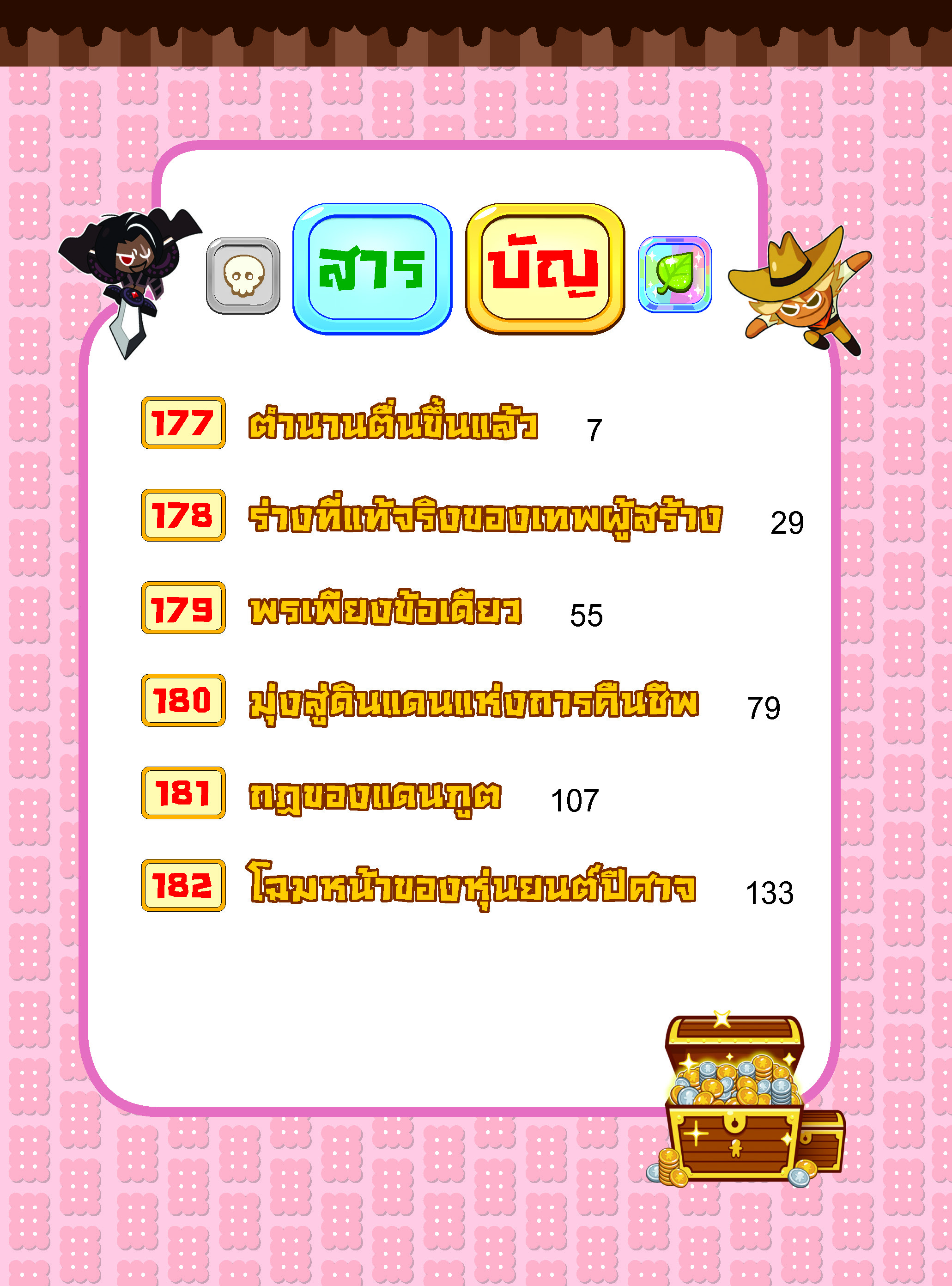 คุกกี้รันเอาชีวิตรอด เล่ม 25 ในแดนภูต คุกกี้แม่มดแห่งแสงในตำนานถูกปลุกให้ตื่นขึ้นและพาเหล่าคุกกี้แม่มดเอาชนะสงครามกับเหล่าเทพเจ้าได้ เทพผู้สร้างจึงตอบแทนด้วยการให้แก๊งคุกกี้จอพรอะไรก็ได้ 1 ข้อ พรเพียงข้อเดียวที่แก๊งคุกกี้อยากขอคืออะไรนะ และเหล่าคุกกี้ที่เผชิญอันตรายจะมีวิธีเอาชีวิตรอดจากสถานการณ์อย่างไร -ความรู้ในเล่ม- ![]() ![]() ![]() ![]() ![]() ![]() ![]() |