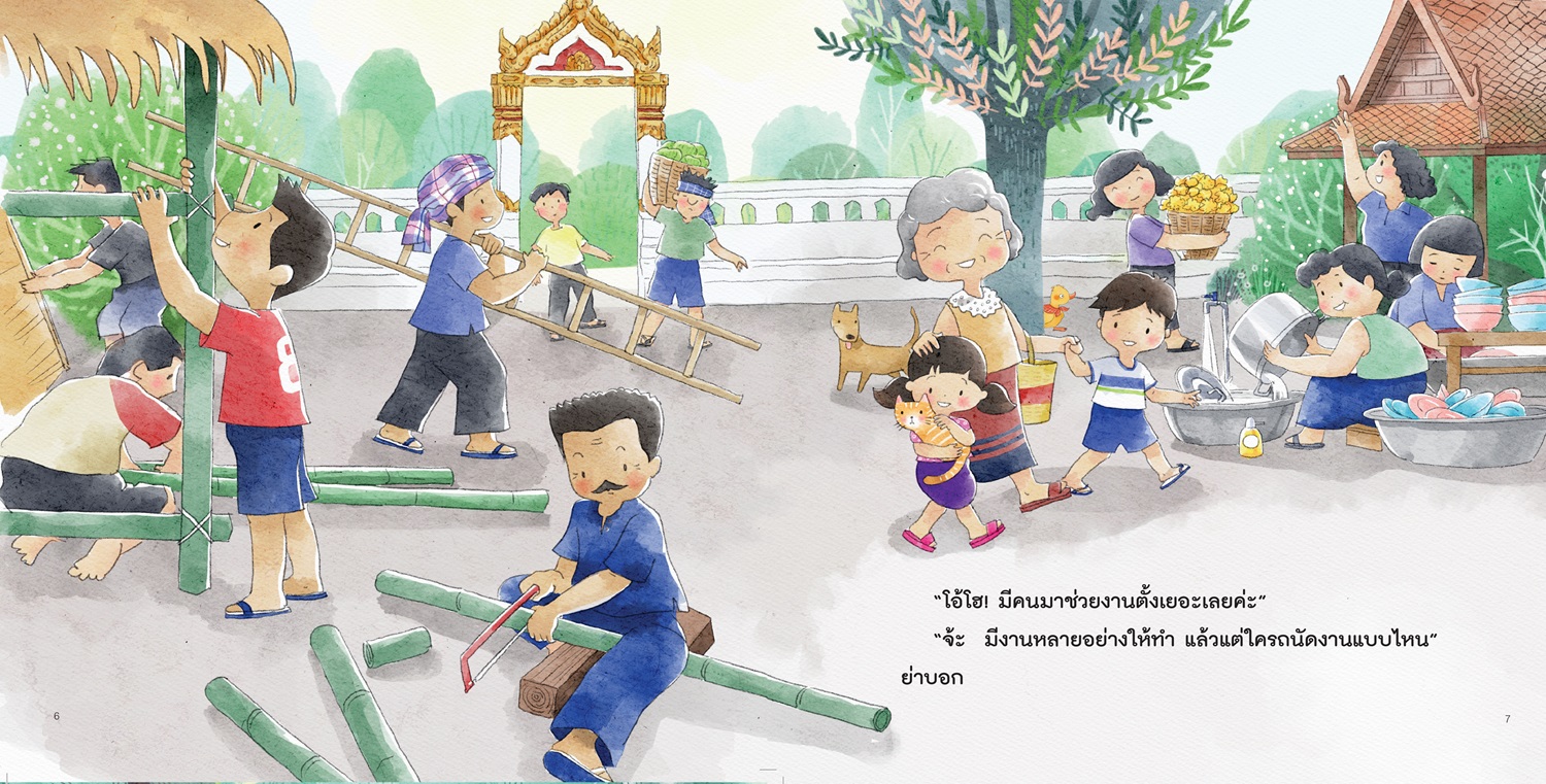 เจ้าเหมียวป่วนงานวัด . วันนี้ย่าพาเอกและขวัญไปที่วัด เพื่อช่วยเตรียมงานประจำปี เจ้าเหมียวก็ตามมาด้วย ทุกคนแยกย้ายกันเตรียมงาน ขวัญช่วยชาวบ้านทำพวงมโหตร เอกช่วยลุงแดงแขวนธงราว เจ้าเหมียวที่เห็นเชือกธงราวห้อยลงมาก็นึกสนุกไปเล่นเชือกจนธงราวหลุดลงมาพันตัว ชาวบ้านขำความป่วนของเจ้าเหมียวจึงพูดกันว่าสงสัยเจ้าเหมียวคงอยากช่วยงานด้วย . ![]() ![]() ![]() ![]() |