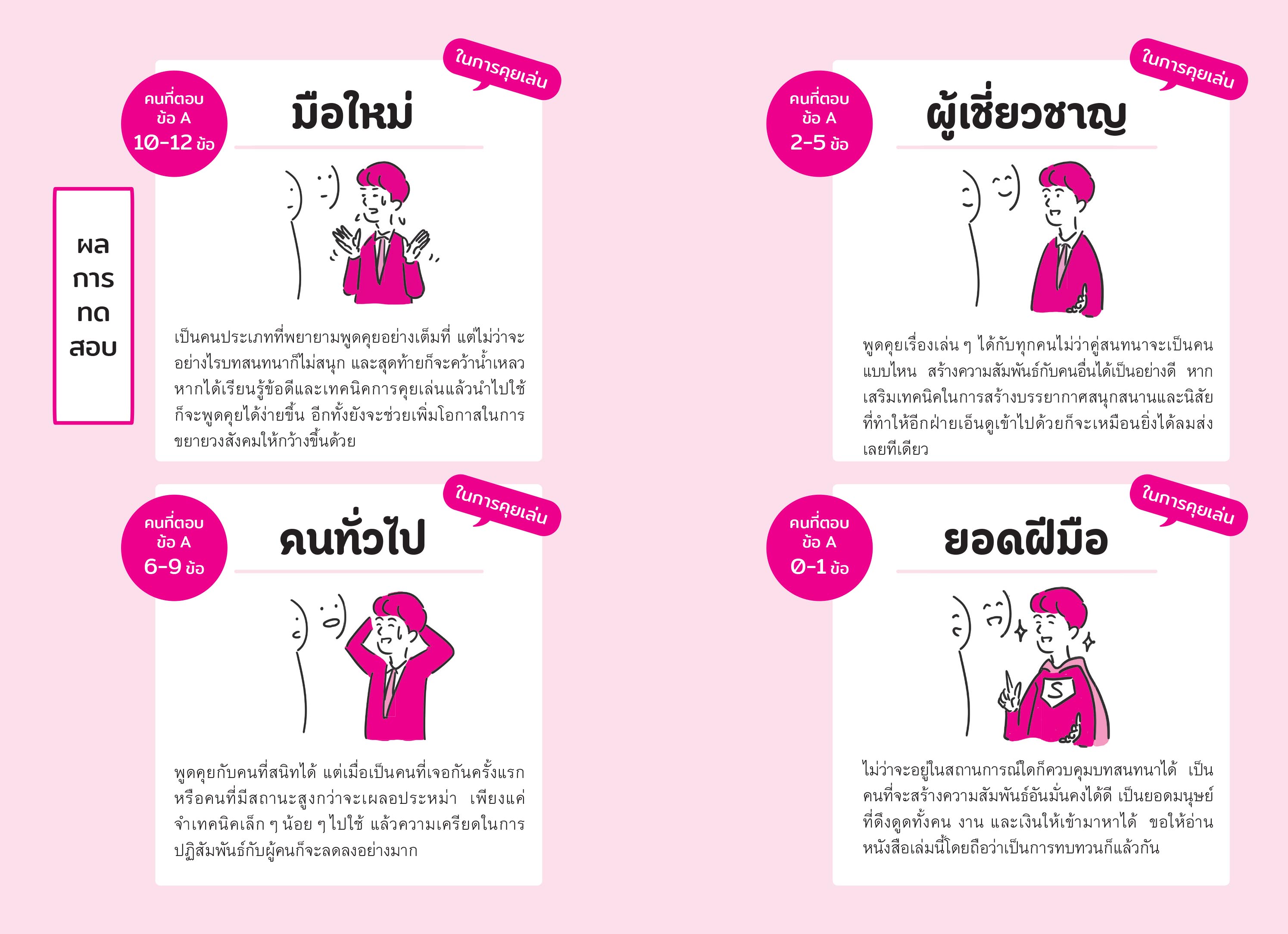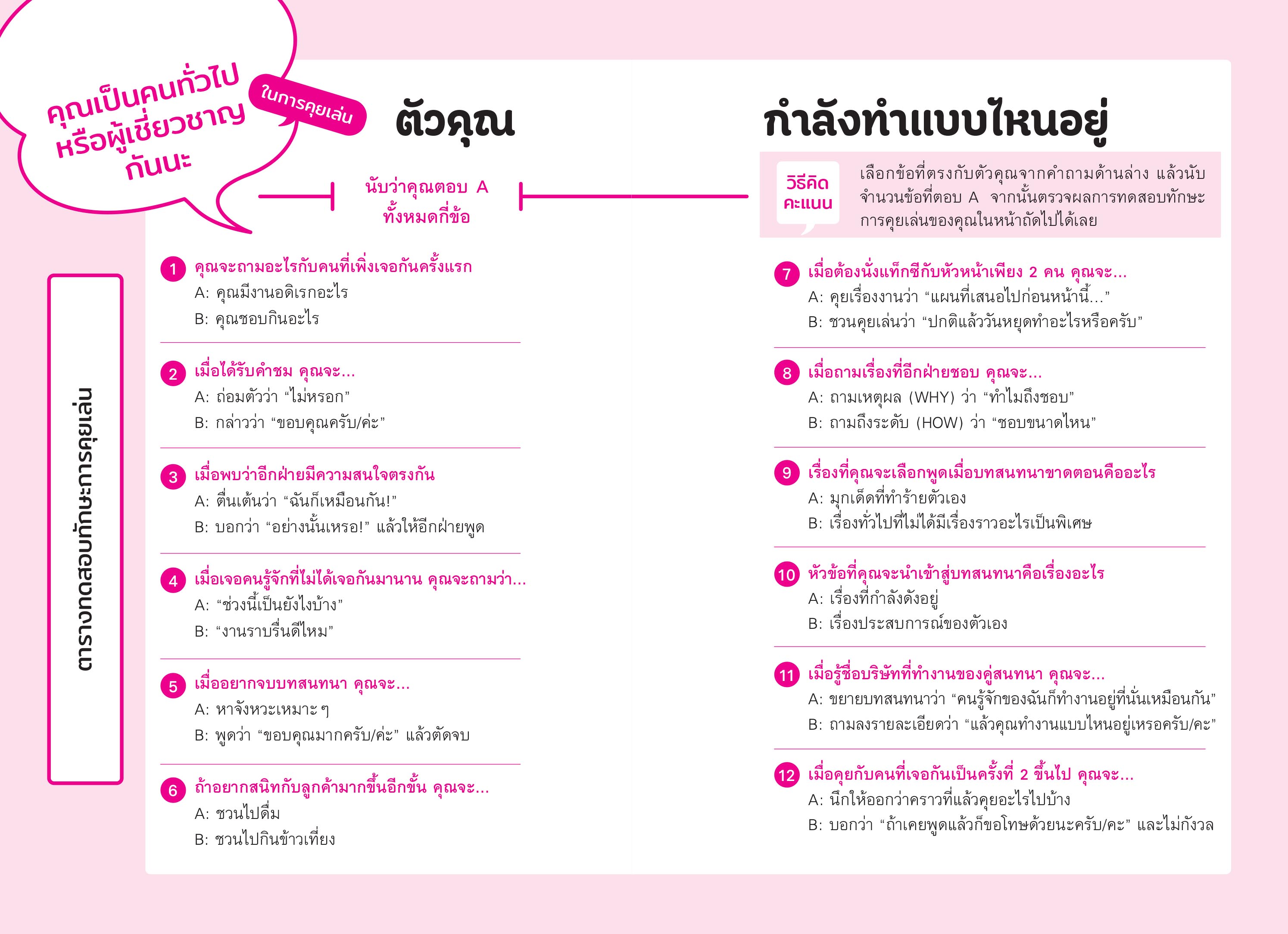 - แบ่งหมวดหมู่ไว้ชัดเจนว่าเป็นการคุยเล่นกับใคร แต่ละบทมีสถานการณ์และตัวอย่างคำพูดที่พบบ่อย พร้อมให้คำแนะนำที่จำเอาไปใช้ได้เลย