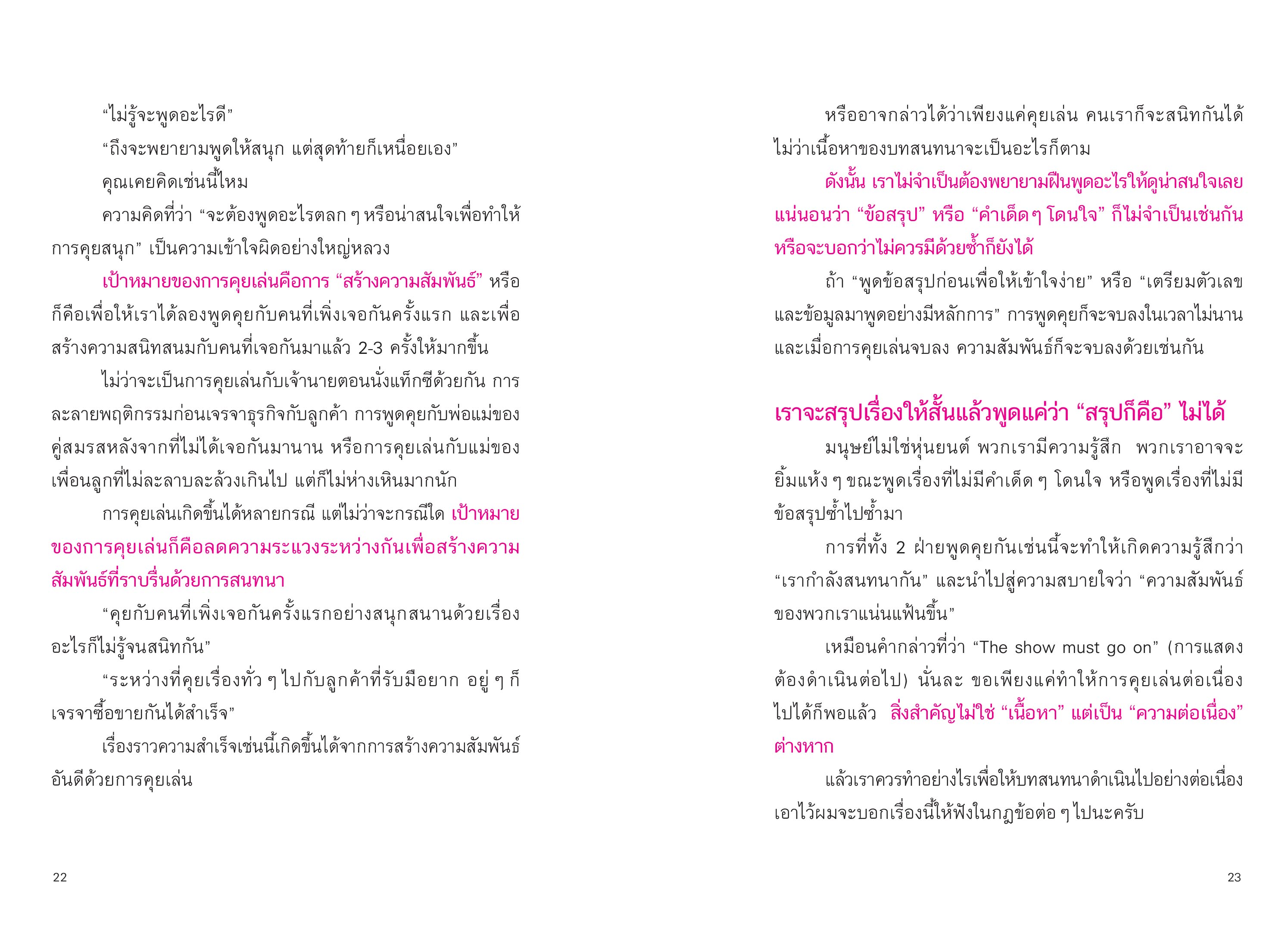 คุณเคยรู้สึกว่าการชวนคุยหรือการคุยเล่นเป็นเรื่องยากบ้างไหม จะเงียบก็ไม่ดี จะพูดก็ไม่รู้จะพูดอะไร ถ้าเป็นคนรู้จักหรือคนสนิทก็ยังคุยได้อยู่หรอก แต่ถ้าเป็นคนไม่รู้จักหรือคนที่ยังไม่สนิท เช่น เพื่อนร่วมงาน เจ้านาย กค้าคนสำคัญที่เพิ่งได้พบหน้ากันล่ะ จะชวนคุยอย่างไรดี หนังสือเล่มนี้จะบอกคุณว่าการคุยเล่นไม่ใช่เรื่องยาก ที่คุณรู้สึกว่ายากเป็นเพราะ “การคุยเล่นแตกต่างจากการสนทนาทั่วไปโดยสิ้นเชิง” นั่นเอง หากลองนำเทคนิคที่สรุปไว้ในหนังสือเล่มนี้ไปใช้ ไม่ว่าจะคุยเล่นกับใคร คุณก็จะคุยได้อย่างสบายๆ และเพิ่มความสัมพันธ์ได้อย่างรวดเร็วแน่นอน